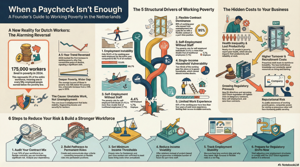 TL;DR: 175,000 workers in the Netherlands lived below the poverty line in 2024 despite being employed. This marks the first increase after five years of decline. The cause is employment instability, not unemployment. Flexible contracts, inexperience, self-employment without staff, and single-income households drive this structural problem. Founders who rely on flexible labor structures contribute to the risk and face delayed costs through turnover, regulation, and reputational damage.