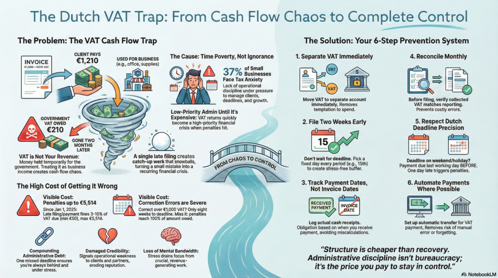 - Prevention requires six controls: separate VAT immediately, file two weeks early, track payment dates instead of invoice dates, reconcile monthly, mark Dutch deadline precision, and automate payment.